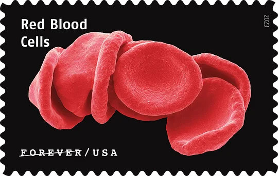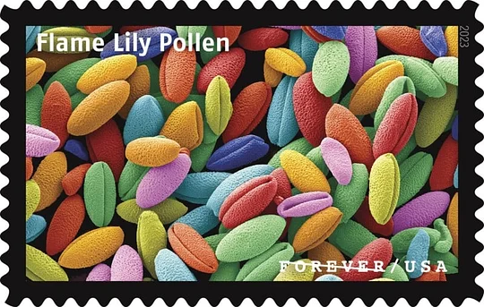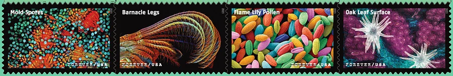 The stamps include vivid images of red blood cells, tthe feather of a macaw parrot, a knotted strand of human hair, moss leaves, diatom shells (photosynthesizing algae), freshwater protozoans, an acorn barnacle, a moth's antenna, the front foot oa diving beetle, neurons from a mouse's brain, bone tissue from a sstarling, scales on the wing of a Madagascan sunset moth,a juvenile zebrafish, mushroom gills, the tongue of a freshwater snail, a blue button (an organism similar to a jellyfish), mold spopres, the legs (known as cirri) of a barnacle, flame lily pollen, and the surface of a southern live oak leaf.