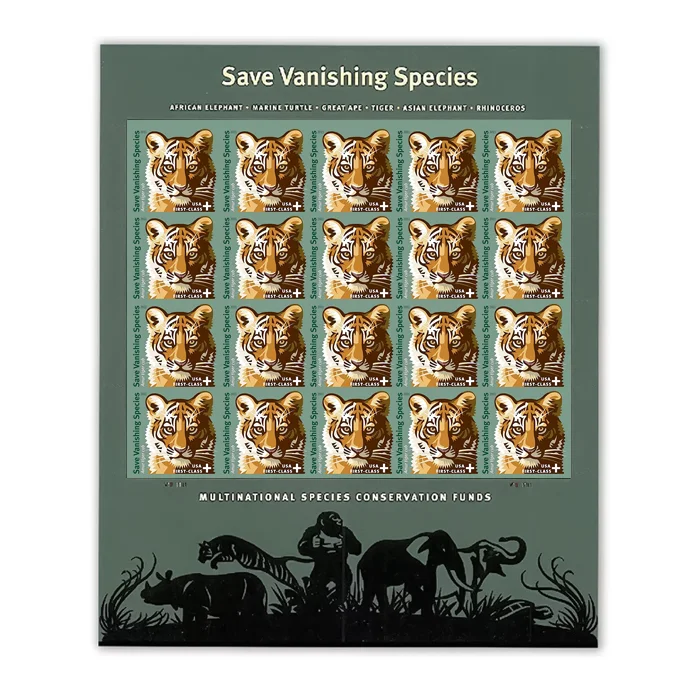 Featuring a bold graphic of an Amur tiger cub, the artwork of the Save Vanishing Speciesâ„¢ First-Class Semipostal stamp depicts just one of the magnificent animals that it is designed to help. Your purchase benefits conservation funds that are helping create hope for the future. Over $6.4 million has been raised for the cause.